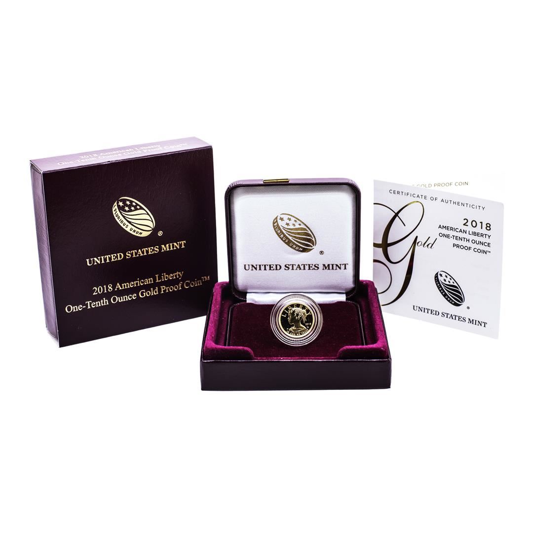 One 2018-W $10 Proof American Liberty 1/10 Oz. Gold Coin With Box & COA.