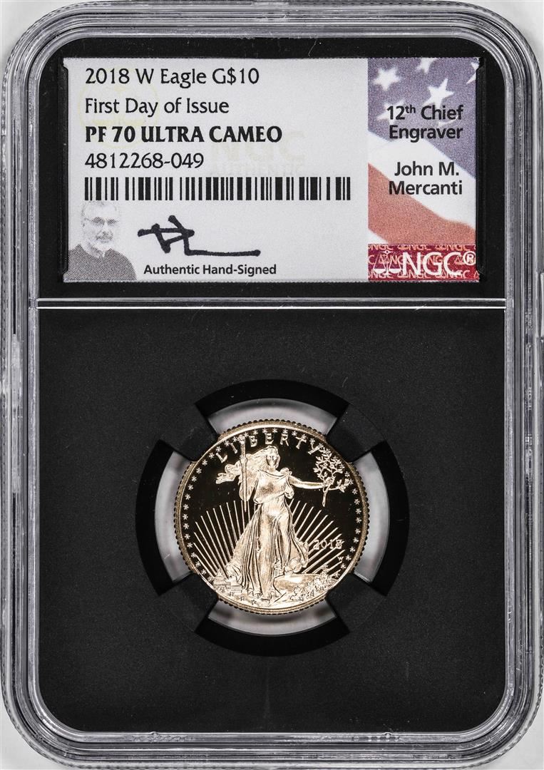 One 2018-W Proof $10 American Gold Eagle Coin NGC PF70 Ultra Cameo Mercanti Signed FDOI. NGC Certified.