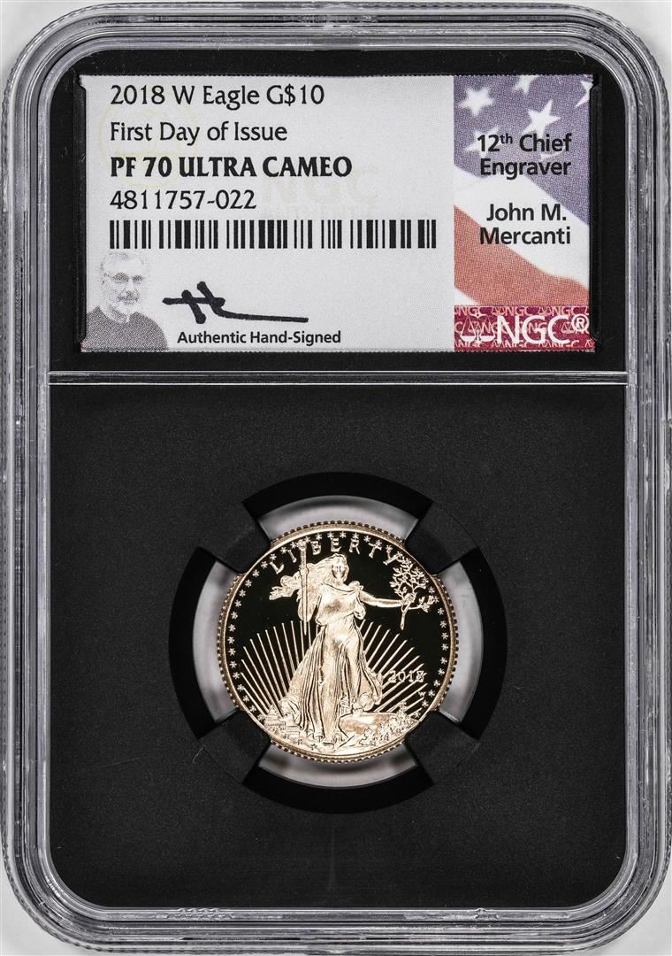 One 2018-W Proof $10 American Gold Eagle Coin NGC PF70 Ultra Cameo Mercanti Signed FDOI. NGC Certified.