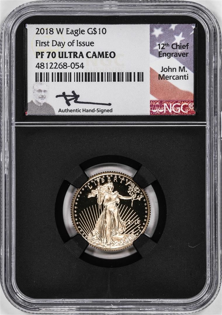 One 2018-W Proof $10 American Gold Eagle Coin NGC PF70 Ultra Cameo Mercanti Signed FDOI. NGC Certified.