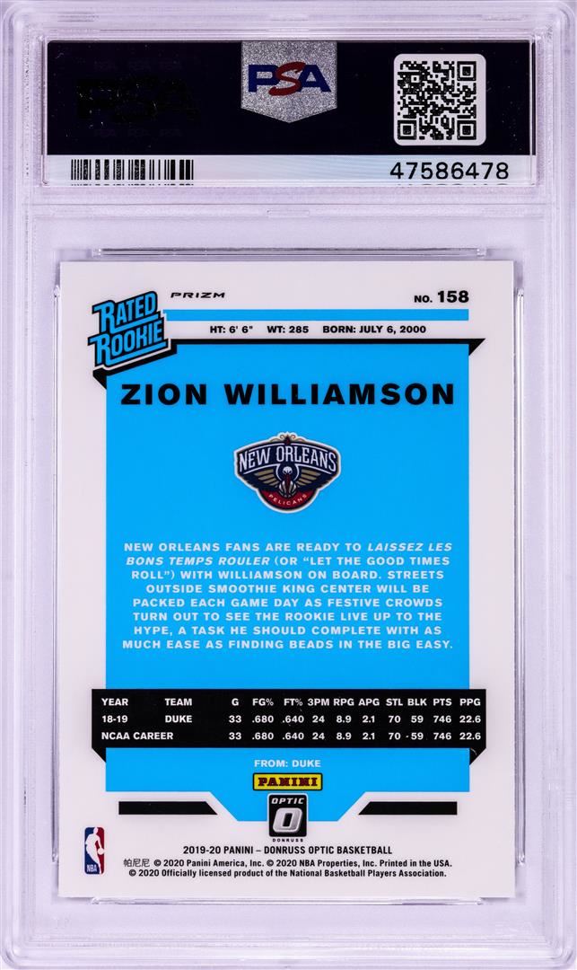 One 2019 Panini Donruss Optic Fanatics Zion Williamson NBA Card #158 PSA Gem Mint 10. PSA Certified.