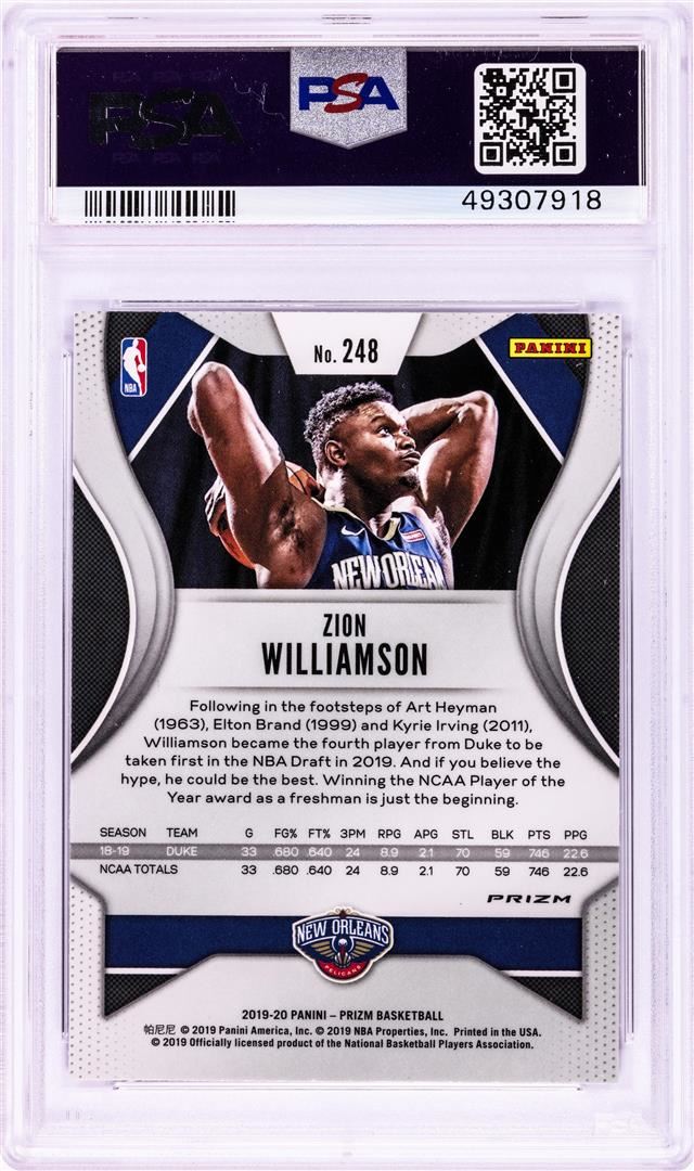 One 2019 Panini Prizm Fast Break Zion Williamson Rookie NBA Card #248 PSA Near Mint 8. PSA Certified.