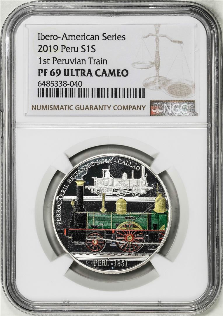 One 2019 Peru 1 Sol Ibero Historic Peruvian Train Proof Silver Coin NGC PF69 Ultra Cameo. NGC Certified.