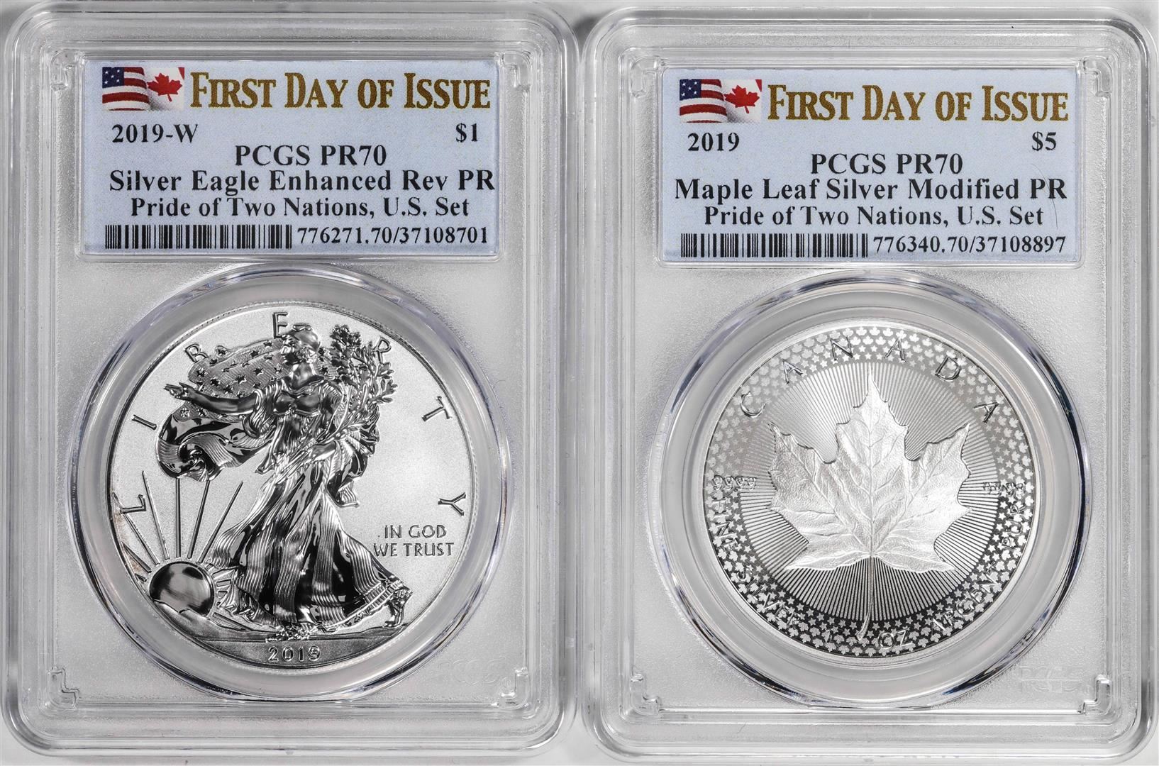 One 2019 Pride of Two Nations (2) Coin Proof Silver Eagle & Maple Leaf Set PCGS PR70 FDOI. PCGS Graded.