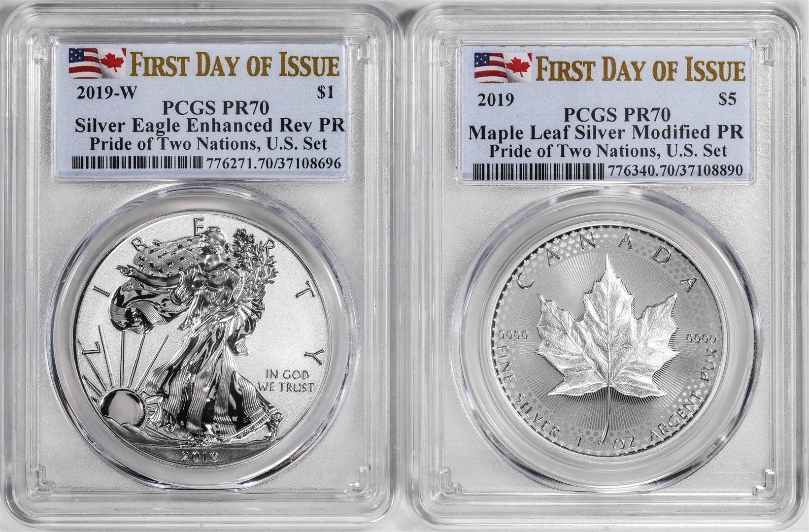 One 2019 Pride of Two Nations (2) Coin Proof Silver Eagle & Maple Leaf Set PCGS PR70 FDOI. PCGS Graded.