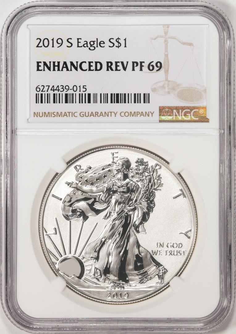 One 2019-S $1 Enhanced Reverse Proof American Silver Eagle Coin NGC Enhanced Rev PF69. NGC Certified.