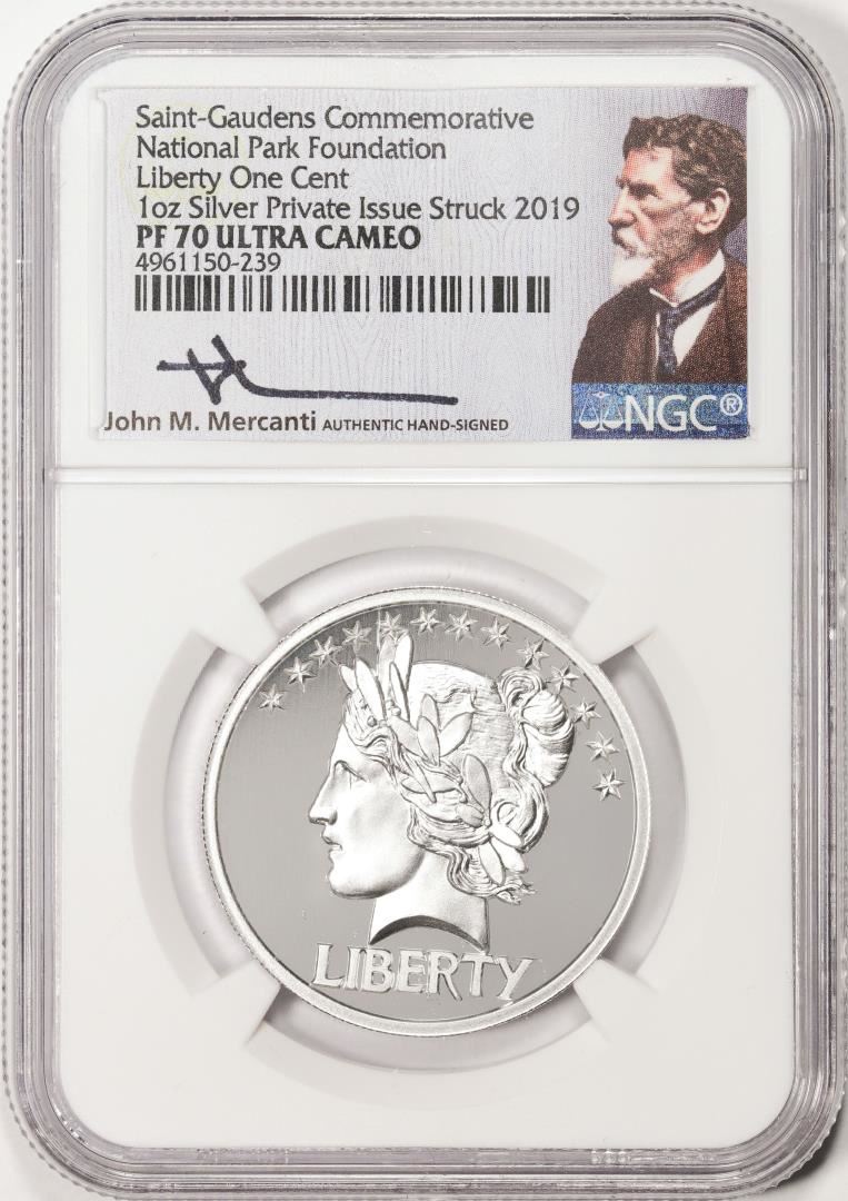 One 2019 Saint-Gaudens Commemorative Silver Coin NGC PF70 Ultra Cameo Mercanti Signature. NGC Certified.