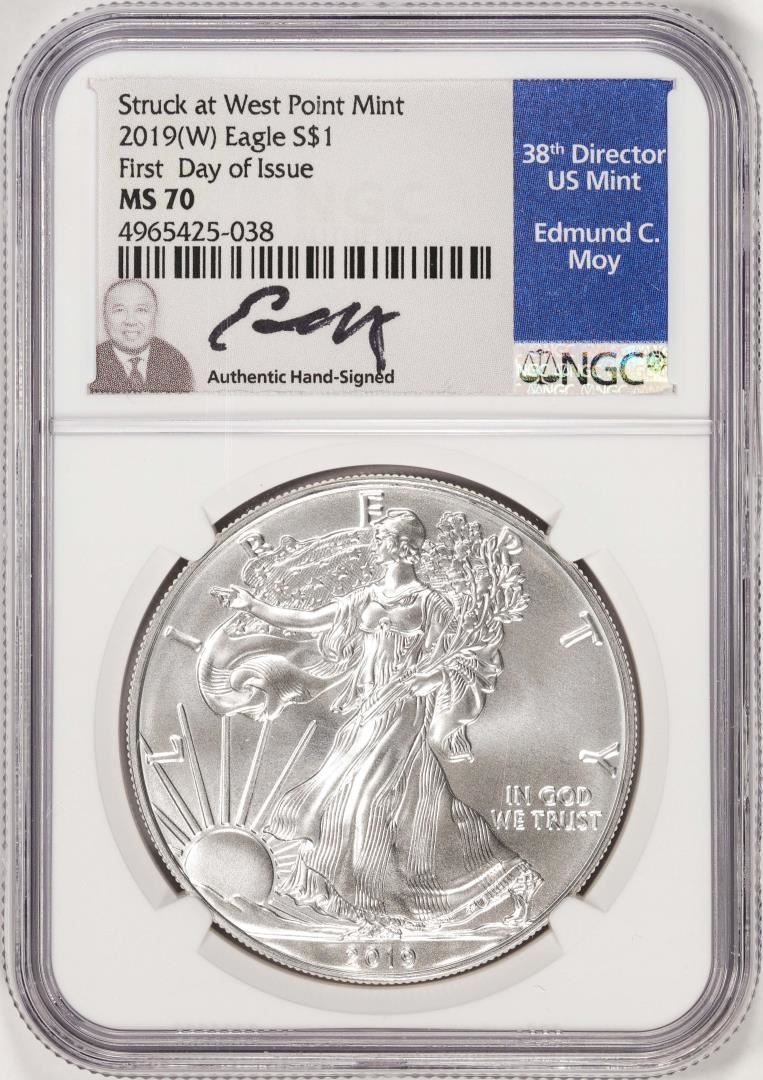 2019(W) $1 American Silver Eagle Coin NGC MS70 FDOI Moy Signature West Point Mint