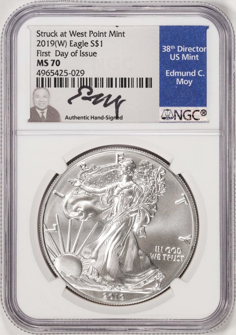 One 2019(W) $1 American Silver Eagle Coin NGC MS70 FDOI Moy Signature West Point Mint. NGC Certified.