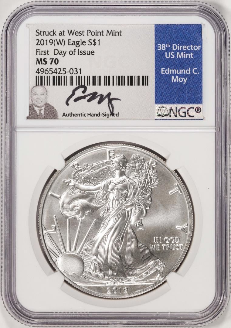 One 2019(W) $1 American Silver Eagle Coin NGC MS70 FDOI Moy Signature West Point Mint. NGC Certified.