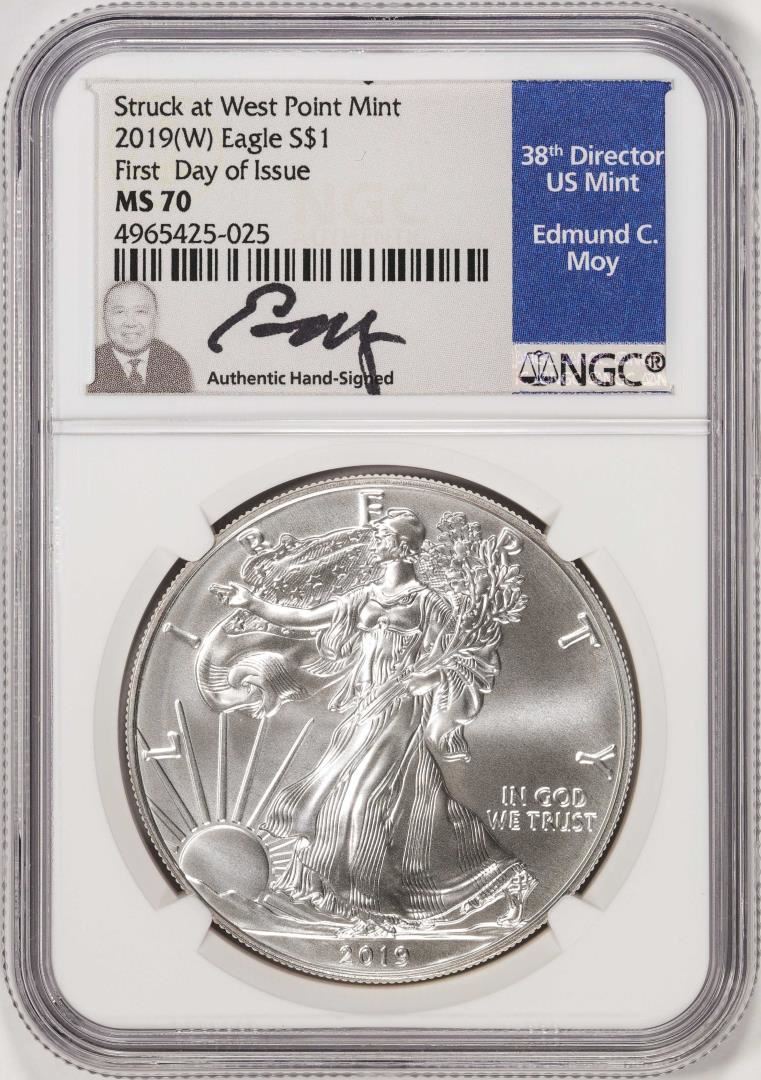 One 2019(W) $1 American Silver Eagle Coin NGC MS70 FDOI Moy Signature West Point Mint. NGC Certified.