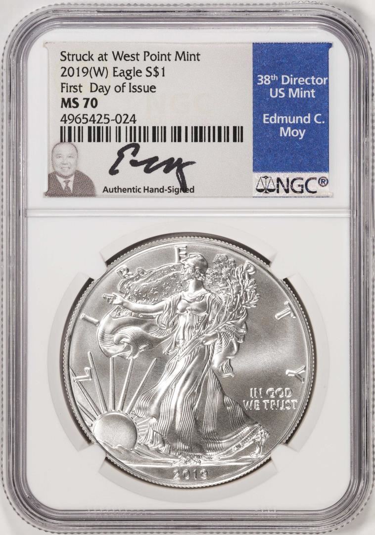 One 2019(W) $1 American Silver Eagle Coin NGC MS70 FDOI Moy Signature West Point Mint. NGC Certified.