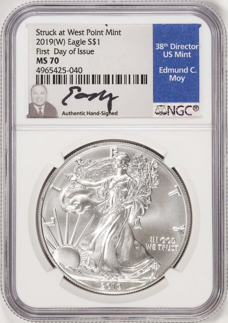 2019(W) $1 American Silver Eagle Coin NGC MS70 FDOI Moy Signature West Point Mint