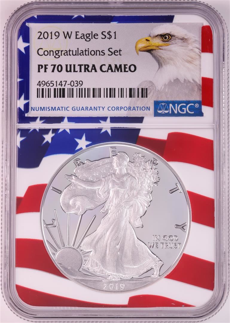 2019-W $1 Proof American Silver Eagle Coin NGC PF70 Ultra Cameo Congratulations Flag