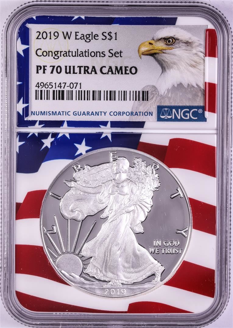 2019-W $1 Proof American Silver Eagle Coin NGC PF70 Ultra Cameo Congratulations Flag