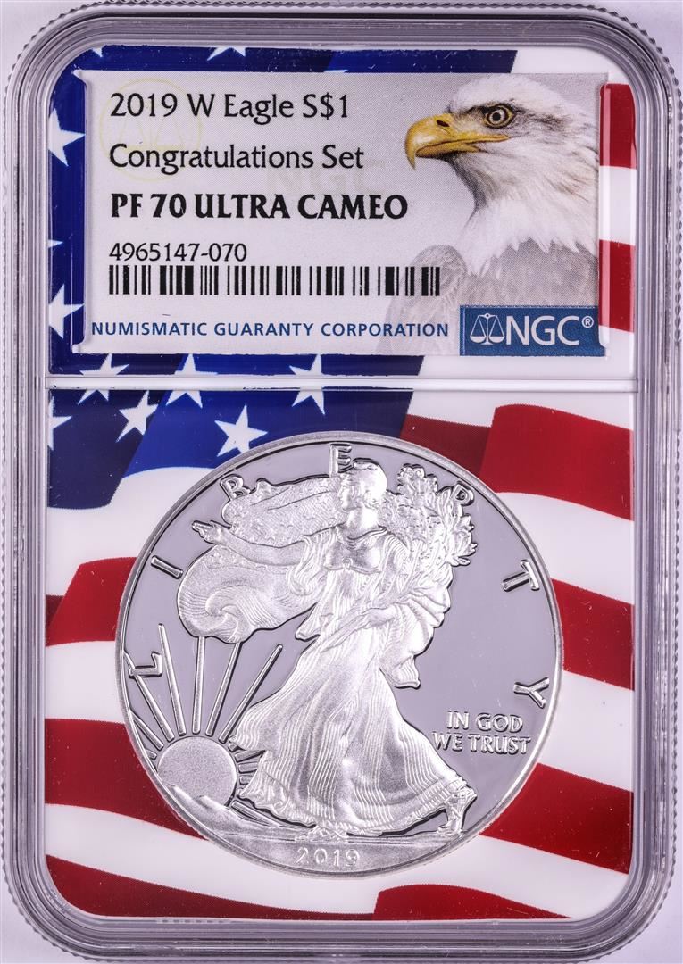 2019-W $1 Proof American Silver Eagle Coin NGC PF70 Ultra Cameo Congratulations Flag