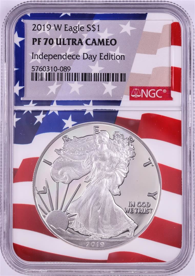 2019-W $1 Proof American Silver Eagle Coin NGC PF70 Ultra Cameo Independence Day Flag