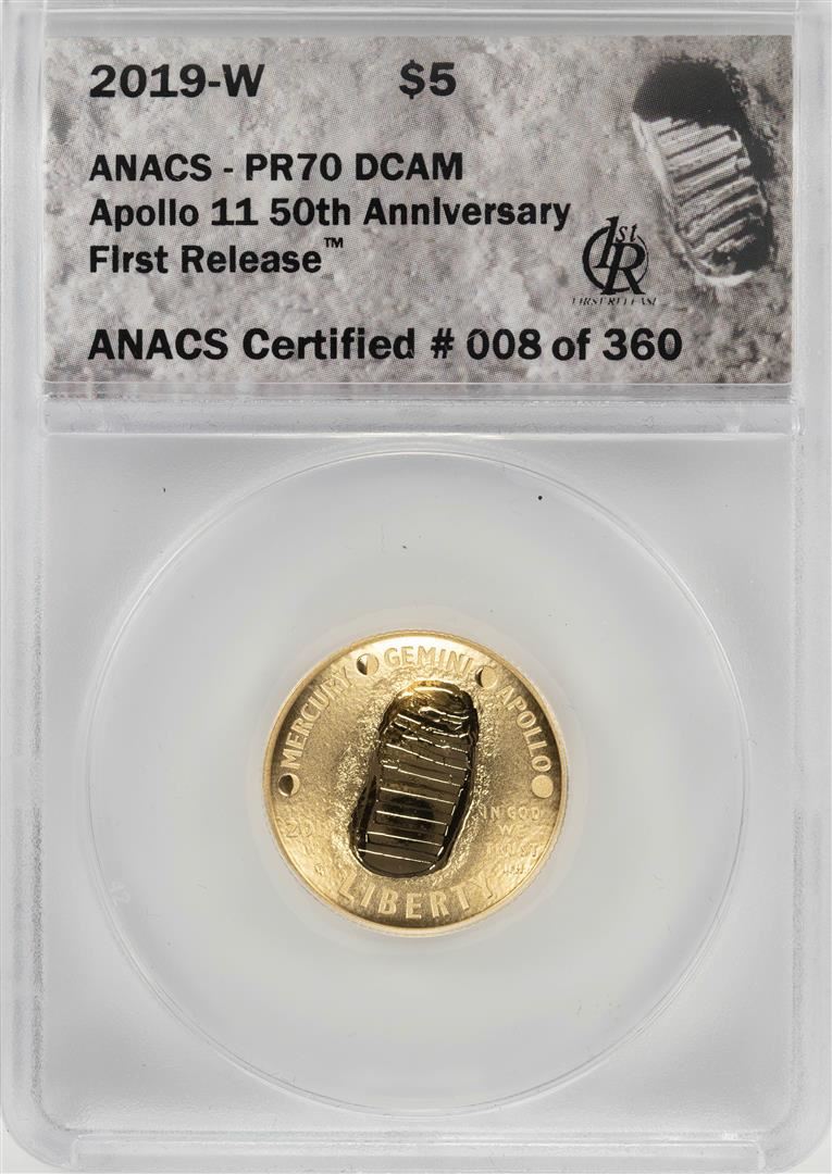 One 2019-W $5 Apollo 11 50th Anniversary Gold Coin ANACS PR70 DCAM First Release. ANACS Certified.