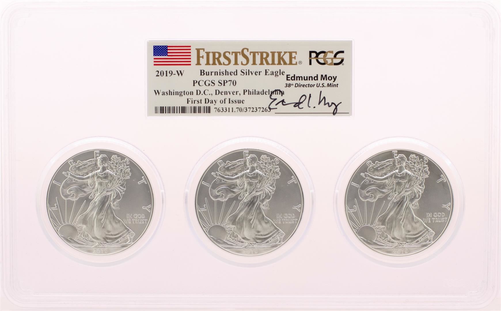 2019-W Burnished Silver Eagle Location Set PCGS SP70 First Strike Edmund Moy Signature