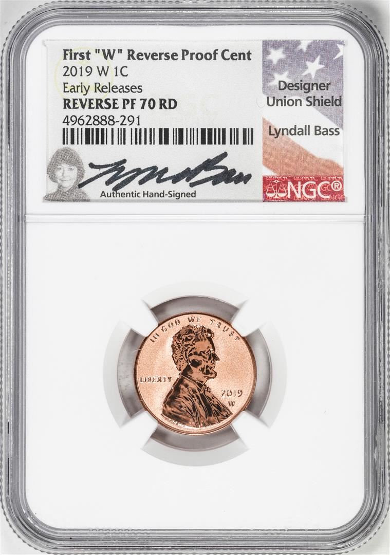 One 2019-W Proof Lincoln Cent Coin PCGS Reverse PF70RD Early Releases Bass Signature. PCGS Graded.