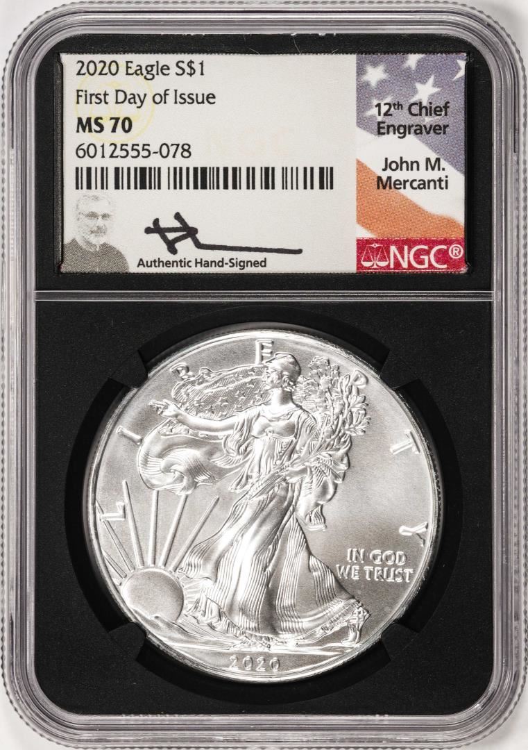 2020 $1 American Silver Eagle Coin NGC MS70 First Day of Issue Mercanti Signature