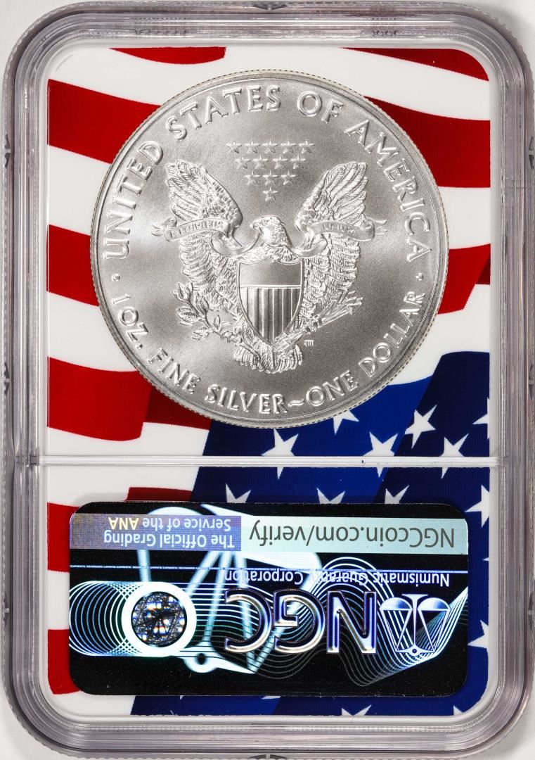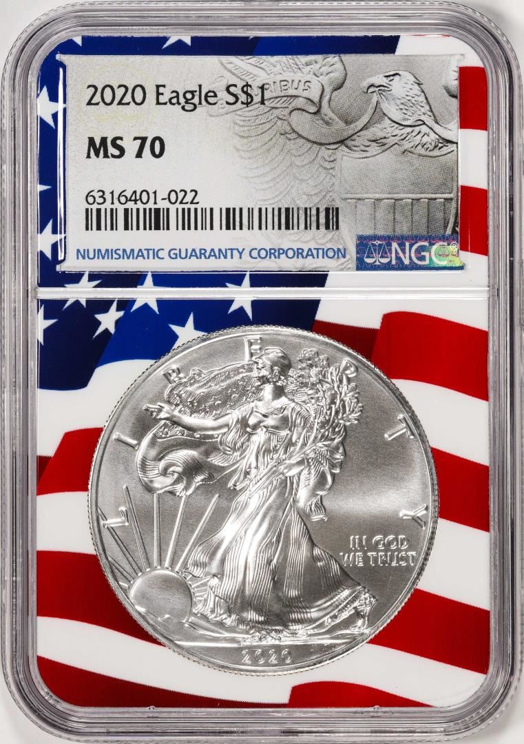One 2020 $1 American Silver Eagle Coin NGC MS70 Flag Core. NGC Certified.