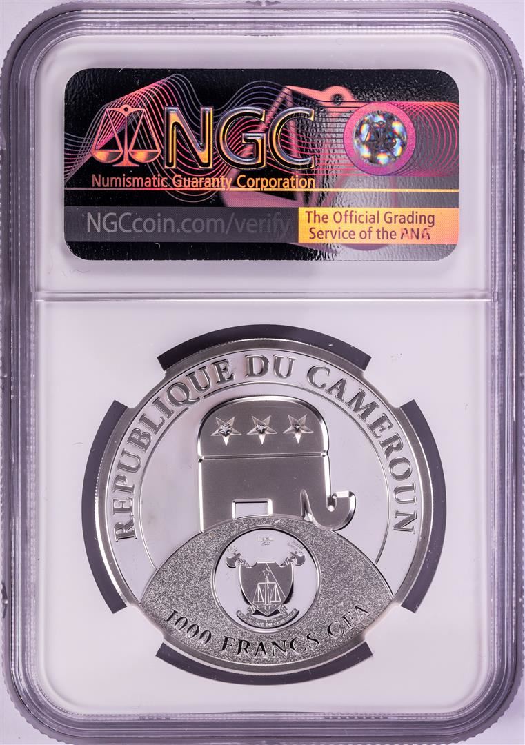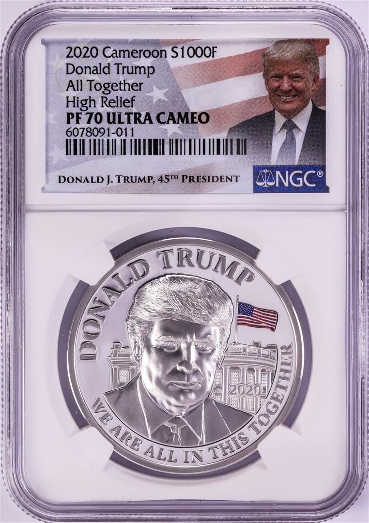 One 2020 Cameroon 1000 Francs High Relief Donald Trump Silver Coin NGC PF70 Ultra Cameo. NGC Certified.