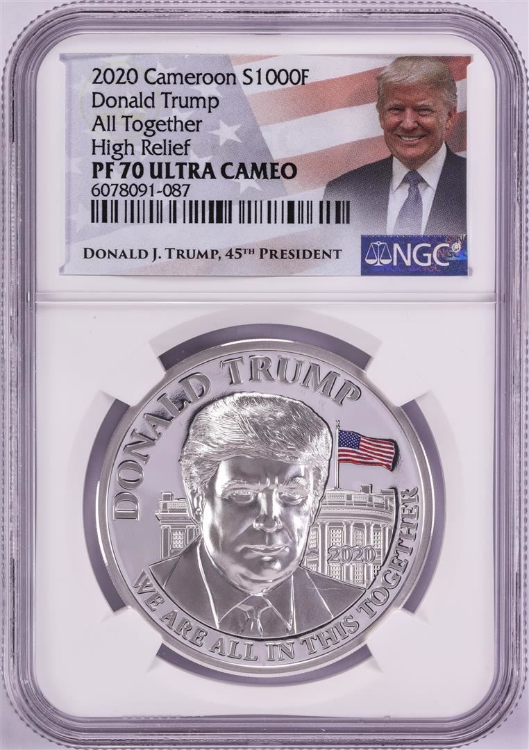 One 2020 Cameroon 1000 Francs High Relief Donald Trump Silver Coin NGC PF70 Ultra Cameo.
