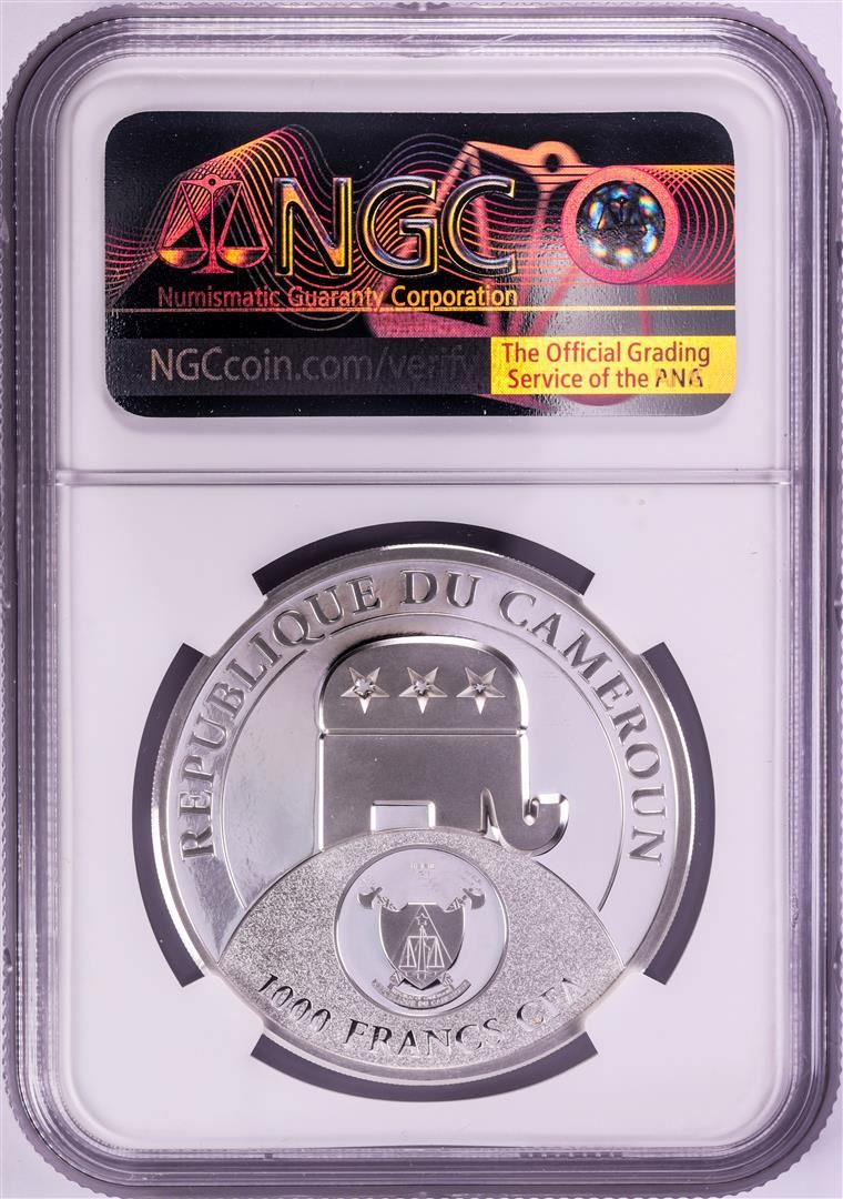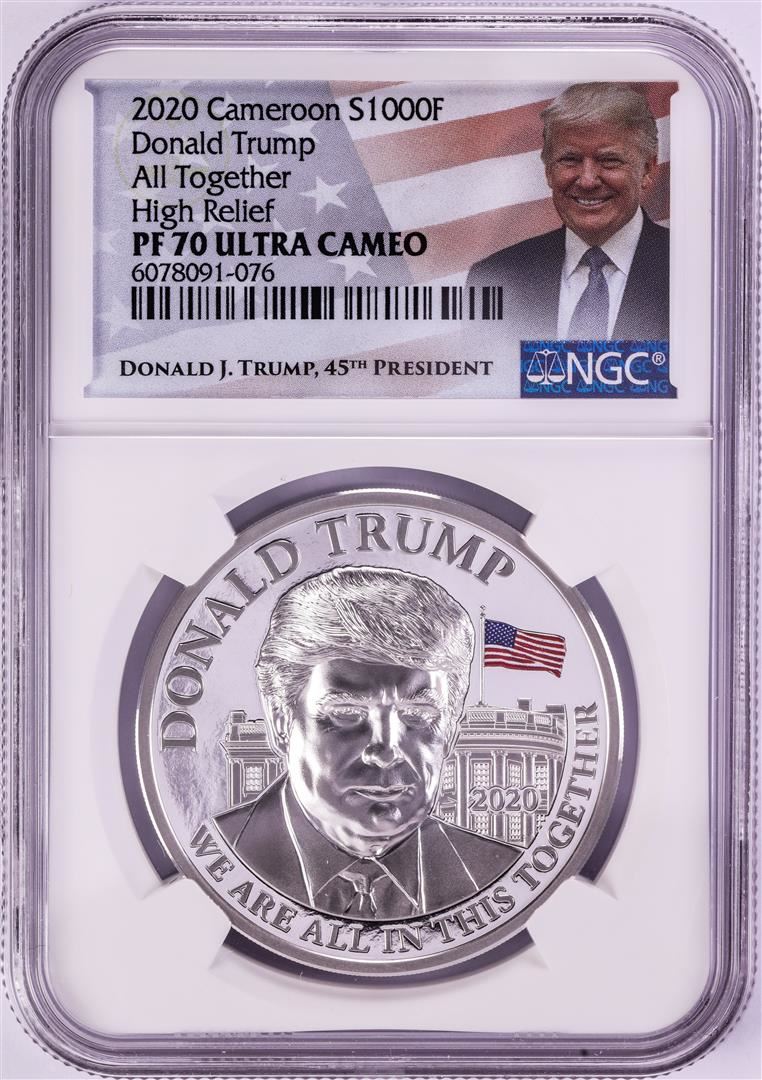 One 2020 Cameroon 1000 Francs High Relief Donald Trump Silver Coin NGC PF70 Ultra Cameo.