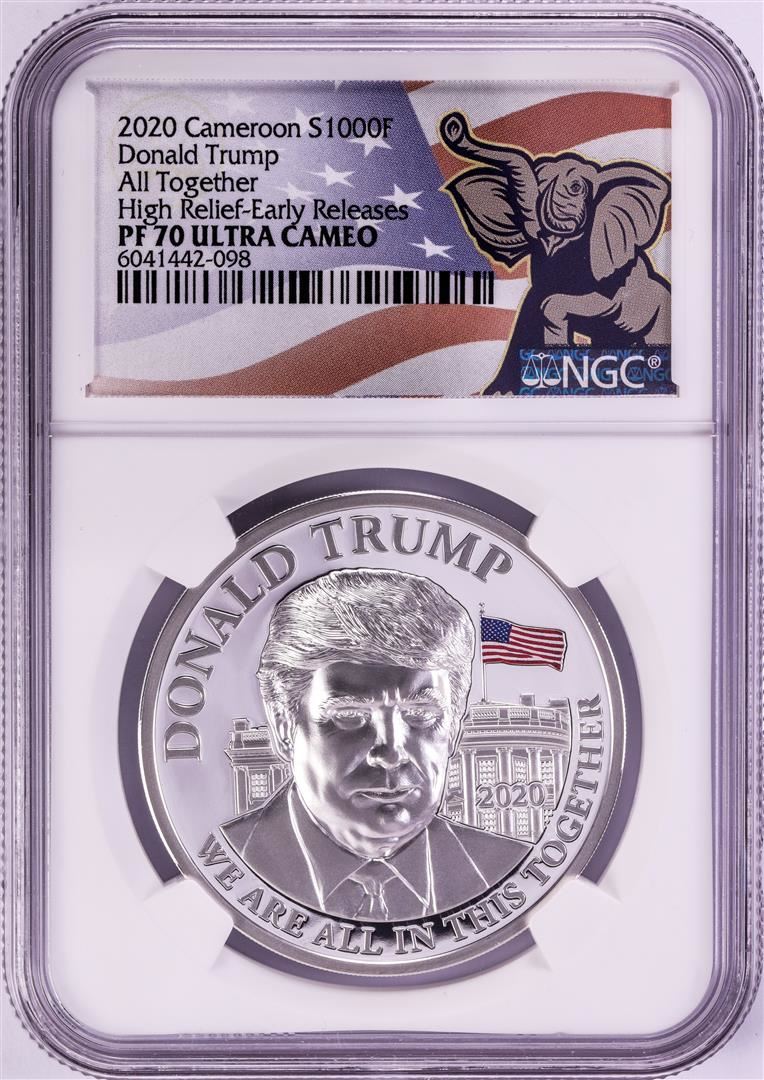 One 2020 Cameroon 1000 Francs High Relief Donald Trump Silver Coin NGC PF70 Ultra Cameo.