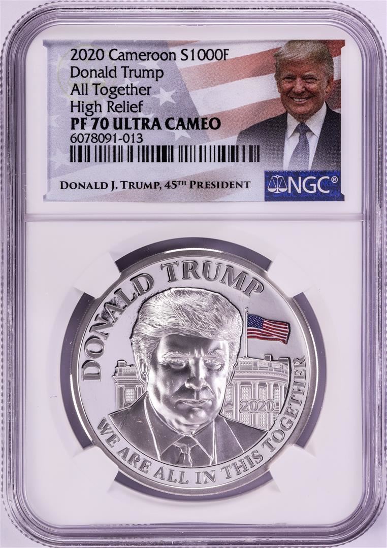 One 2020 Cameroon 1000 Francs High Relief Donald Trump Silver Coin NGC PF70 Ultra Cameo. NGC Certified.