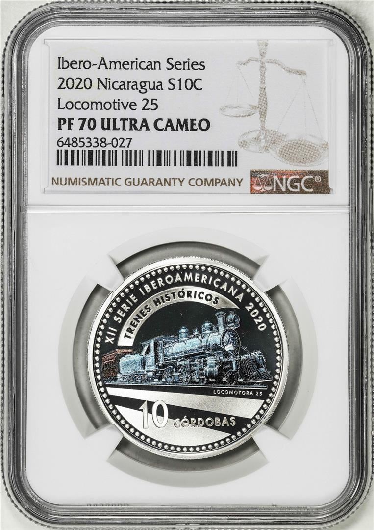 One 2020 Nicaragua 10 Cordobas Locomotive 25 Trains Silver Coin NGC PF70 Ultra Cameo. NGC Certified.