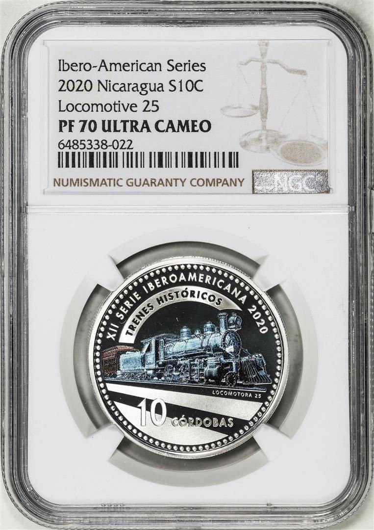 One 2020 Nicaragua 10 Cordobas Locomotive 25 Trains Silver Coin NGC PF70 Ultra Cameo. NGC Certified.