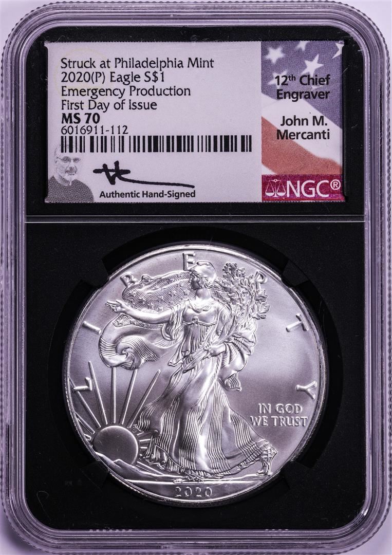 2020(P) $1 American Silver Eagle Coin NGC MS70 FDOI Mercanti Signature Emergency Issue