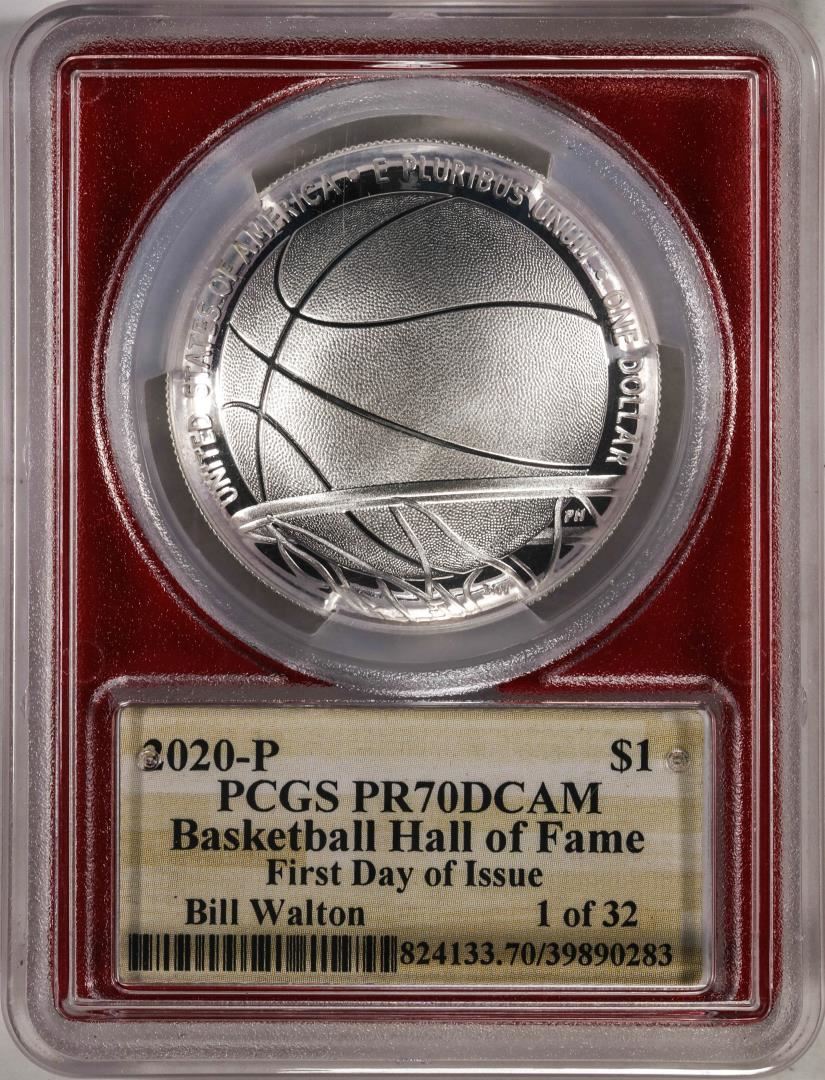 One 2020-P $1 Basketball HOF Silver Dollar Coin PCGS PR70DCAM Bill Walton Signature FDOI. PCGS Graded.