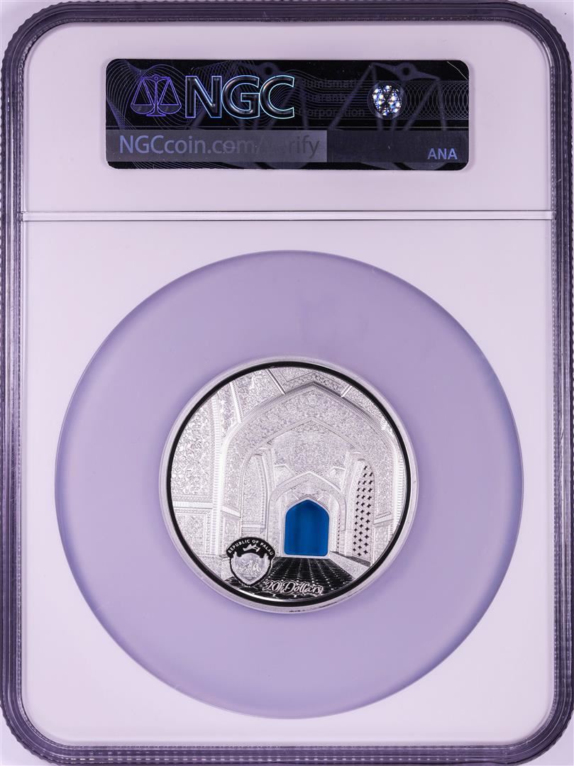 One 2020 Palau $20 Proof Tiffany Art Isfahan Silver Coin NGC PF70 Ultra Cameo ER. NGC Certified.