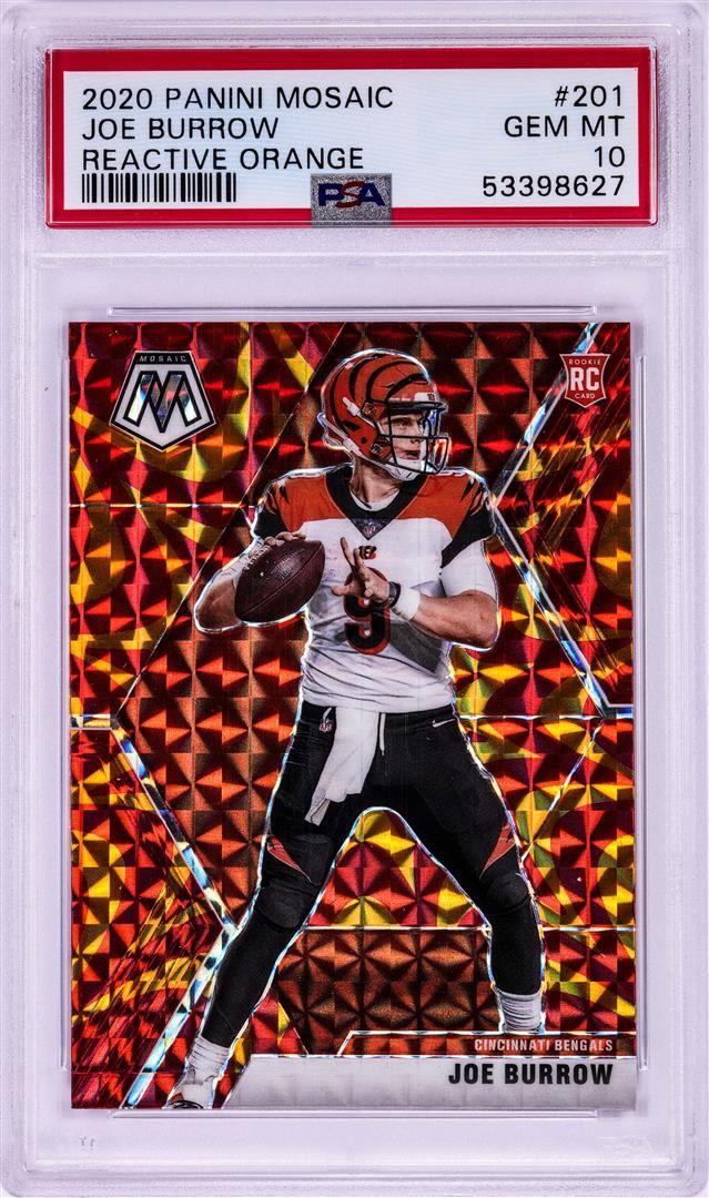 One 2020 Panini Mosaic Reactive Orange Joe Burrow NFL Card #201 PSA Gem Mint 10. PSA Certified.