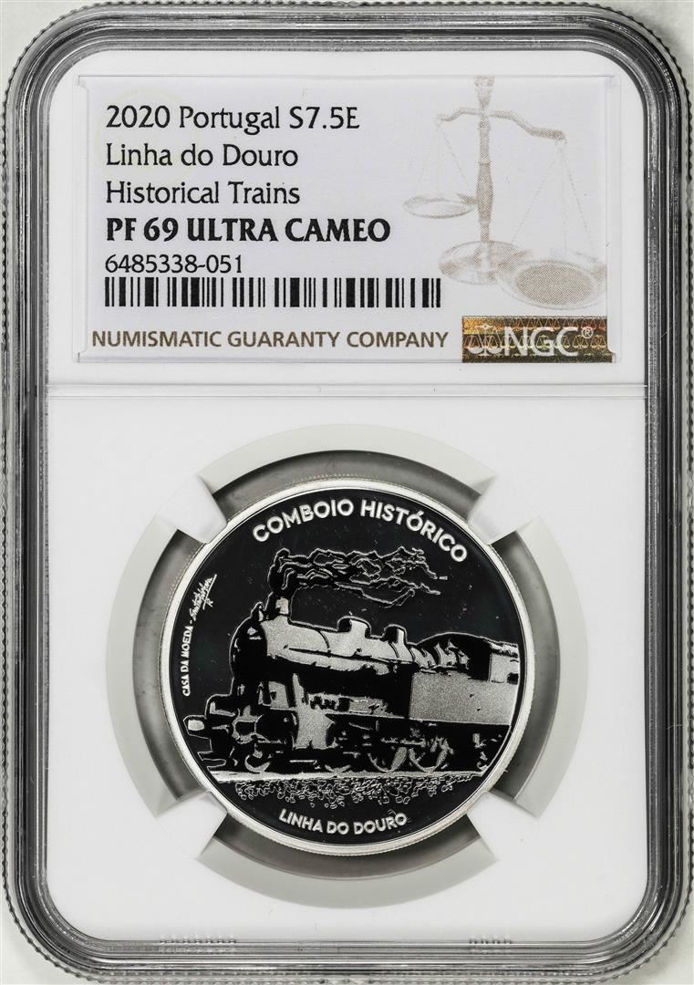One 2020 Portugal 7.5 Euros Ibero Historic Train Proof Silver Coin NGC PF69 Ultra Cameo. NGC Certified.