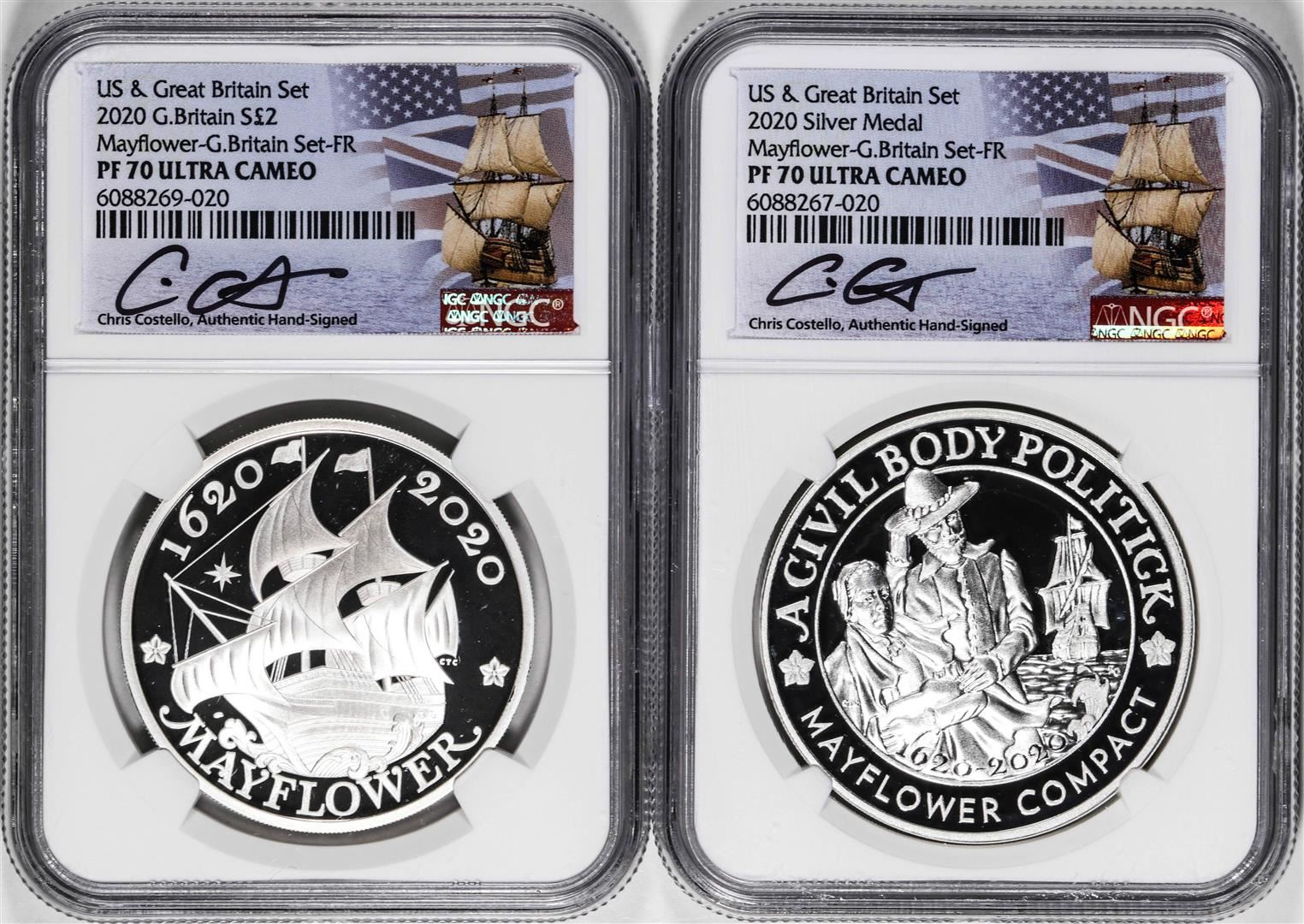 2020 Proof US & Great Britain Mayflower Coin Set NGC PF70 Ultra Cameo Costello Signed