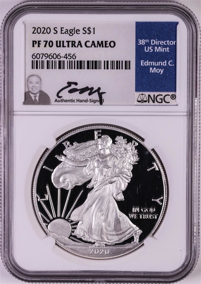 2020-S $1 Proof American Silver Eagle Coin NGC PF70 Ultra Cameo Edmund Moy Signature