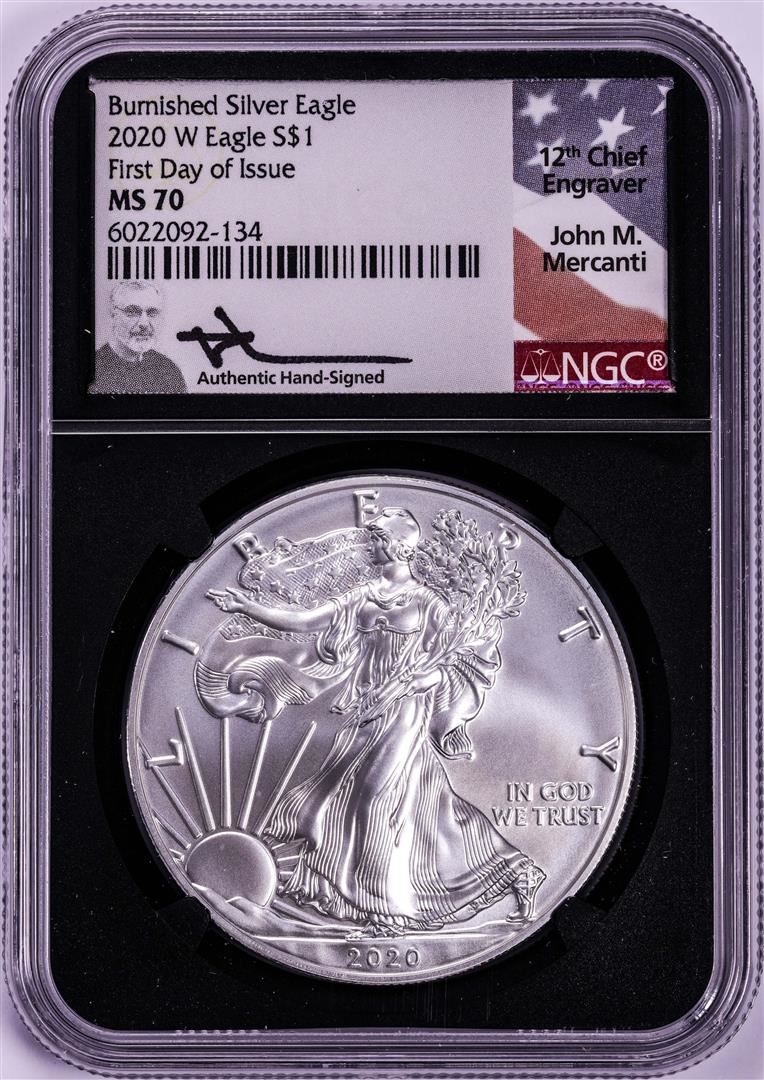 2020-W $1 Burnished American Silver Eagle Coin NGC MS70 Mercanti Signature