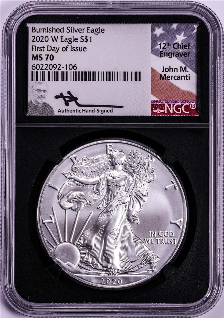 2020-W $1 Burnished American Silver Eagle Coin NGC MS70 Mercanti Signature
