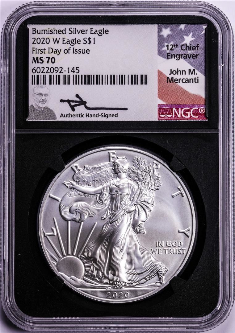 2020-W $1 Burnished American Silver Eagle Coin NGC MS70 Mercanti Signature