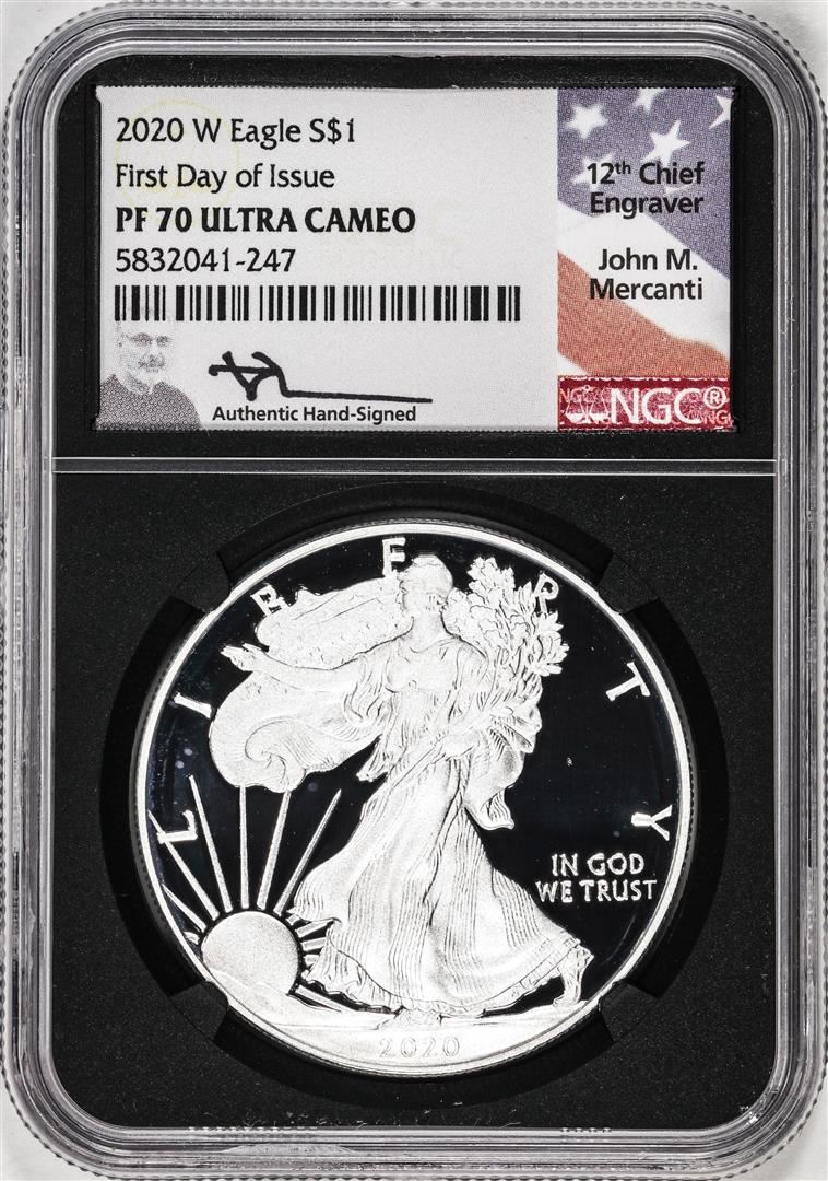 One 2020-W $1 Proof American Silver Eagle Coin NGC PF70 Ultra Cameo FDOI Mercanti Signed. NGC Certified.