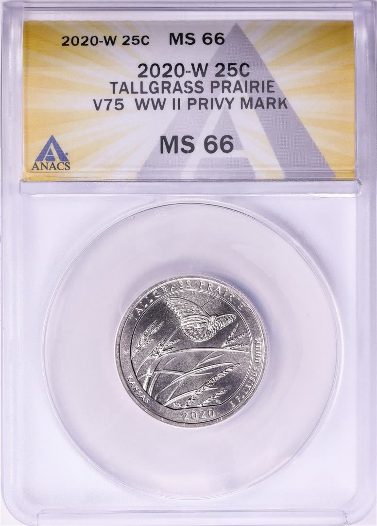 One 2020-W V75 WWII Privy Mark Tallgrass Prairie Quarter Coin ANACS MS66. ANACS Certified.