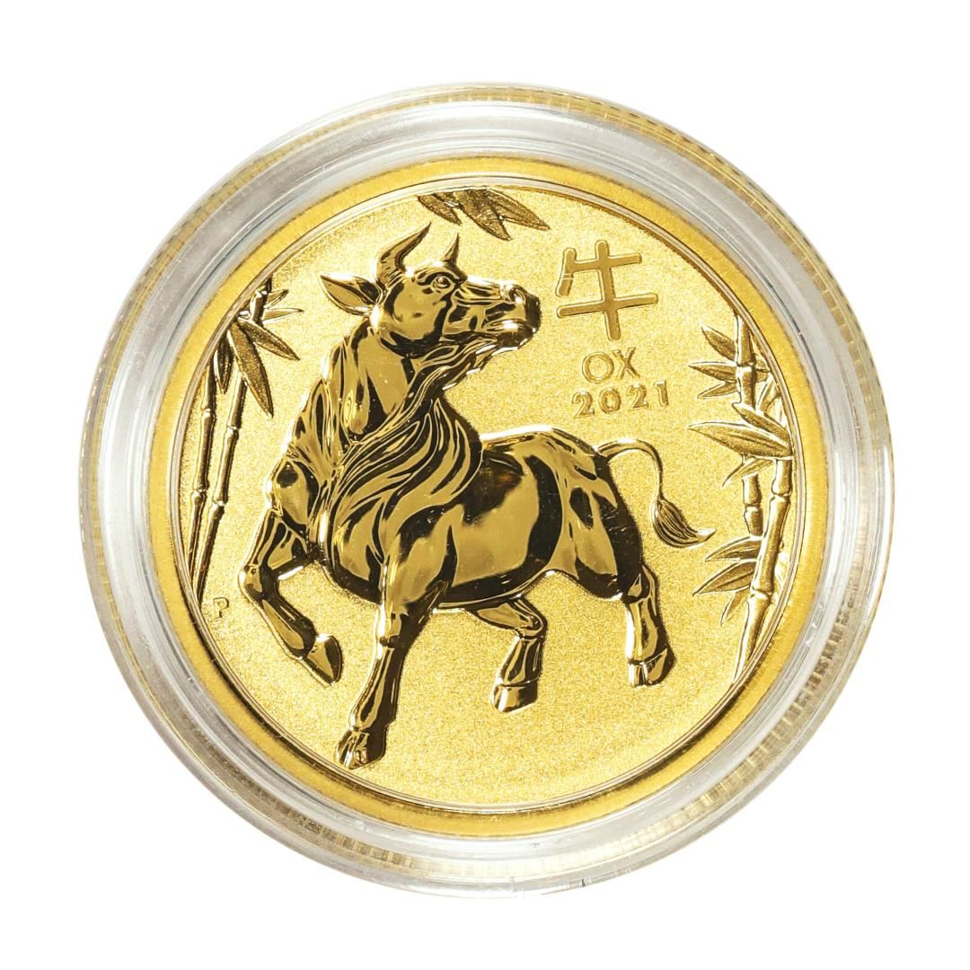 One 2021 $25 Australia Lunar Year of the Ox 1/4 oz. Gold Coin.