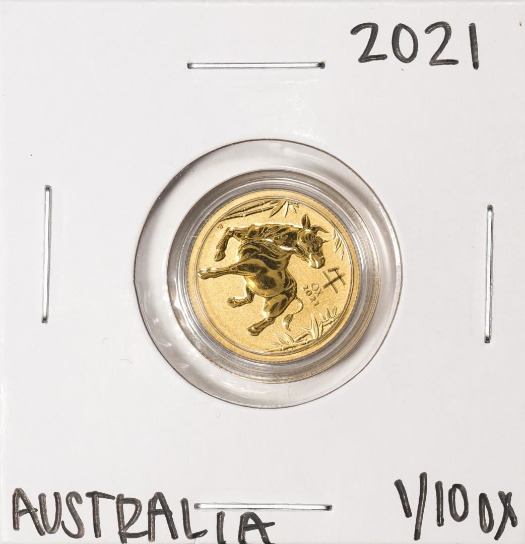 One 2021 Australia $15 Lunar Year of the Ox 1/10 Oz Gold Coin.