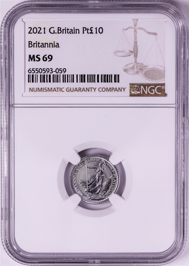 One 2021 Great Britain 10 Pounds Britannia 1/10oz Platinum Coin NGC MS69. NGC Certified.