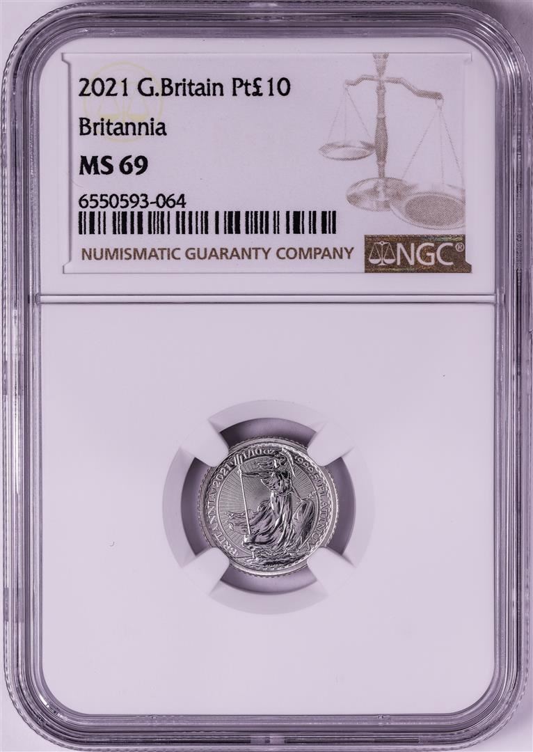 One 2021 Great Britain 10 Pounds Britannia 1/10oz Platinum Coin NGC MS69. NGC Certified.