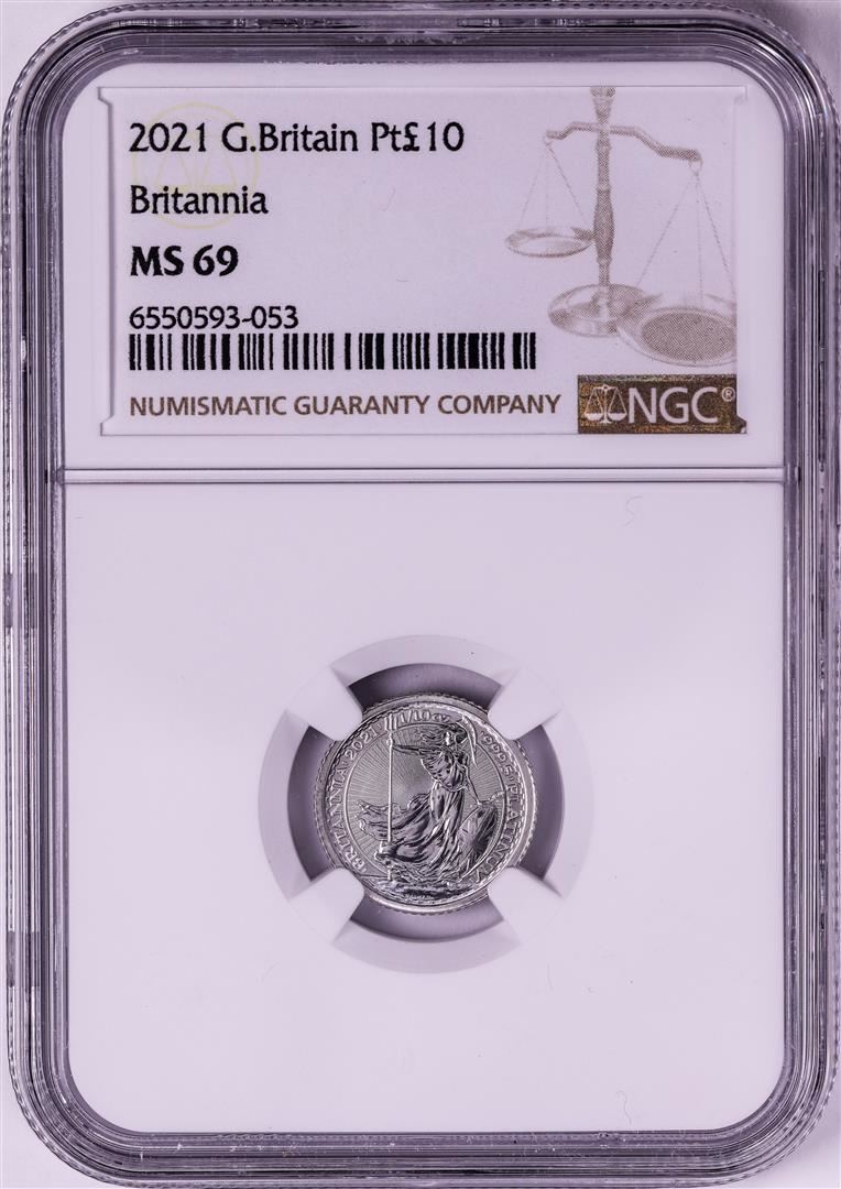 One 2021 Great Britain 10 Pounds Britannia 1/10oz Platinum Coin NGC MS69. NGC Certified.